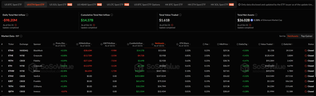 The US Ethereum spot ETFs also saw a net outflow of $98.2 million on October 31. BlackRock’s ETHA recorded the largest outflow of the day at $38.63 million, followed by Fidelity’s FETH with $27.12 million and Grayscale’s ETHE with $13.73 million.