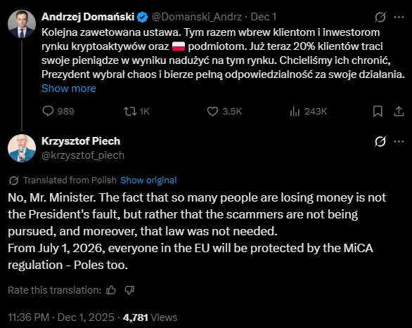 Meanwhile, Polish government has adopted an unchanged version of its crypto-asset market bill, despite the opposition from President Karol Nawrocki.