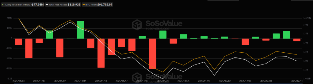 On Thursday, the US BTC spot exchange-traded funds (ETFs) broke a two-day green streak with $77.34 million in outflows. The total net inflow increased slightly to $57.85 billion.