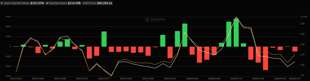 After a minor uptick yesterday, which broke a week-long red streak, the US BTC spot exchange-traded funds (ETFs) posted outflows again on Tuesday. These funds let go of $147.37 million in total on 27 January.