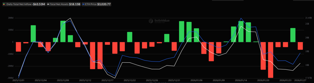 The US ETH ETFs also recorded outflows during the Tuesday session. These totalled to $63.53 million. The total net inflow now stands at $12.36 billion.