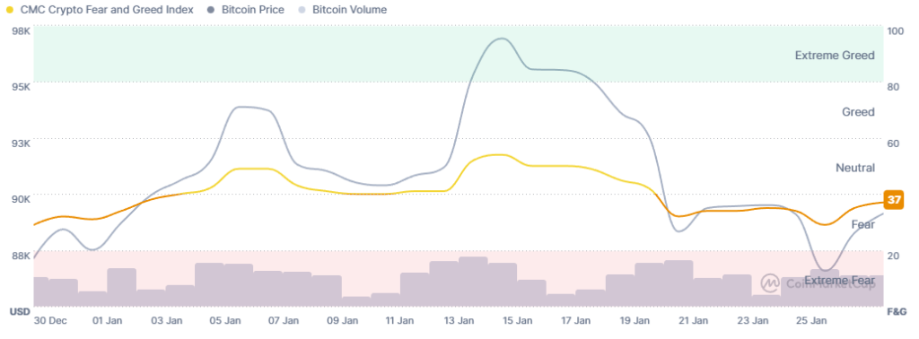 The crypto market has posted a higher increase over the past 24 hours than seen a day prior. Meanwhile, the US stock market closed the previous session with a mixed picture. By the closing time on Tuesday, 27 January, the S&P 500 was up 0.41%, the Nasdaq-100 increased by 0.88%, and the Dow Jones Industrial Average fell by 0.83%. Also, gold futures hit a new record, while their silver counterparts pulled back after a new high seen on Monday.