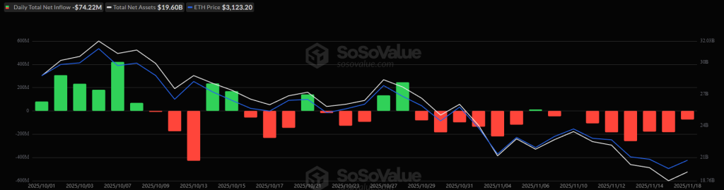 At the same time, the US ETH ETFs also continued their outflow streak for the eighth day in a row, seeing another $75.22 million leave on 18 November. The total net inflow pulled back to $12.88 billion.