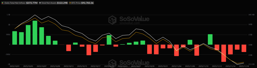 On Tuesday, the US BTC spot exchange-traded funds (ETFs) recorded their fifths consecutive day of outflows, with $372.77 million. This brought the total net inflow back down to $58.22 billion, moving away from the $60 billion mark.