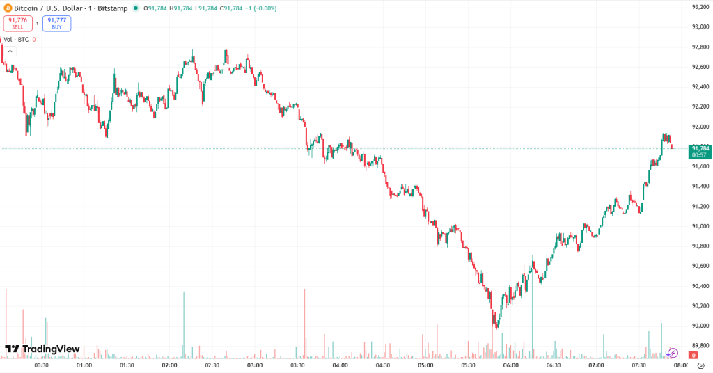 Bitcoin (BTC) has appreciated by 1.5% since this time yesterday, currently trading at $91,381.