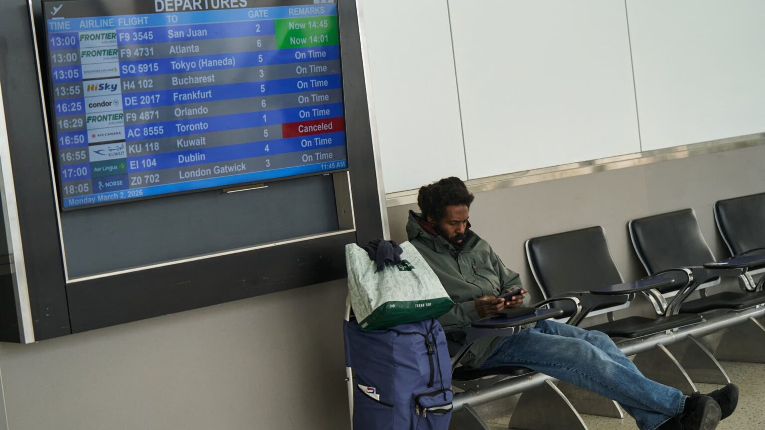 A traveler uses his mobile phone next to a departures board showing a cancelled Kuwait Airways flight, amid the U.S.-Israel conflict with Iran, at Terminal 7 at John F. Kennedy (JFK) International Airport in New York City, U.S., March 2, 2026.