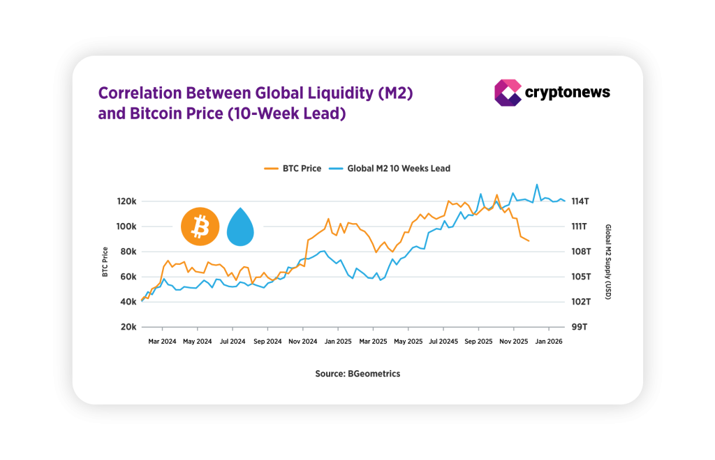 According to liquidity expert Michael Howell, the main driver of Bitcoin price has already shifted from halving to global liquidity. The correlation between BTC and the Global Liquidity Index (GLI) is considered high and sits in the 0.83 to 0.94 range across different studies, which makes liquidity one of the key forces shaping market direction. When the global financial system has more available money, Bitcoin usually moves higher. When liquidity tightens, pressure increases on all risk assets, including crypto.